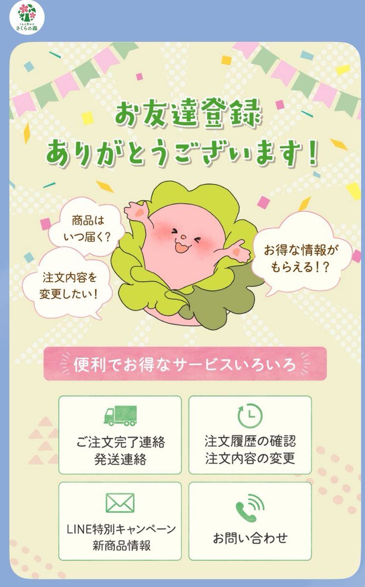 さくらの森では、LINE公式アカウントを追加し、ID連携を行うことで、様々なサービスをご利用いただけます。