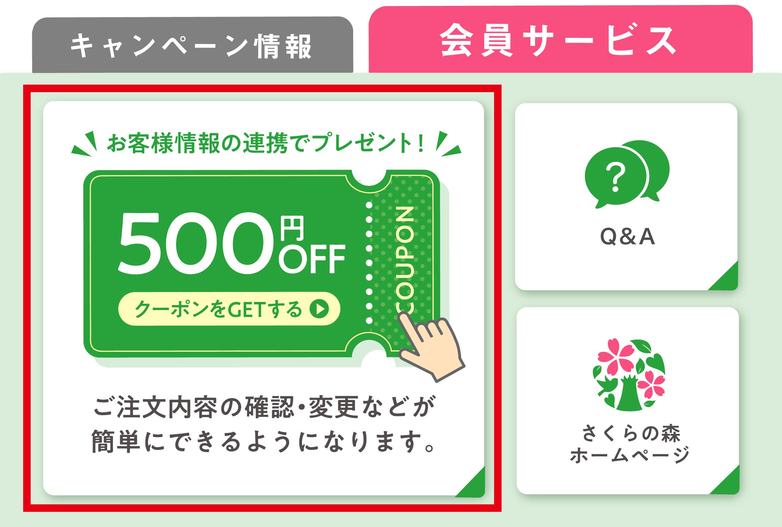 現在キャンペーン期間中につき、さくらの森LINE公式アカウントを友だち追加し、ID連携していただくことで、500円OFFクーポンをプレゼント中です。